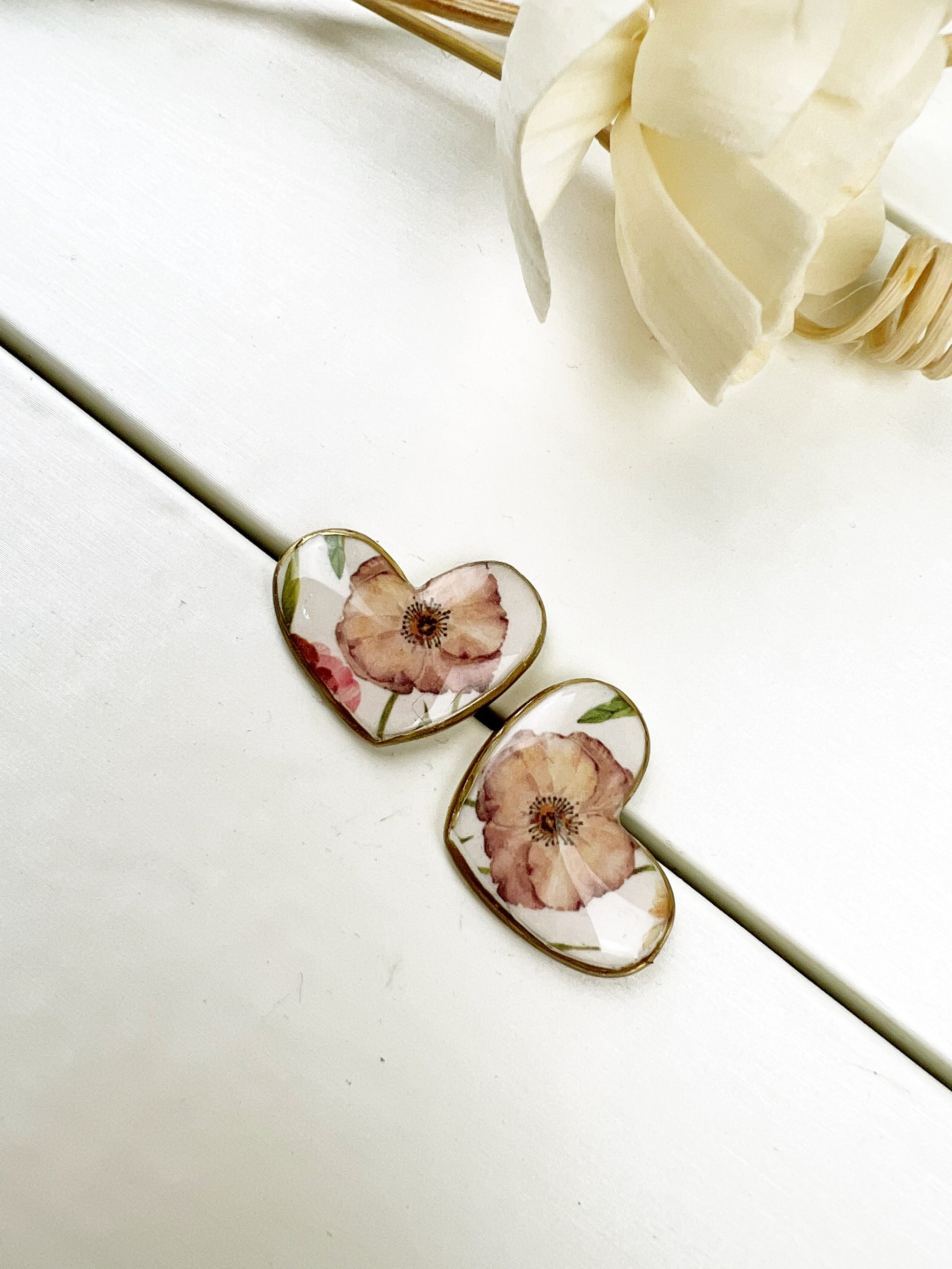 Delicate heart earrings with a floral motif, framed by an elegant gold border. A romantic and luminous accessory, perfect for adding a feminine and refined touch to any look.