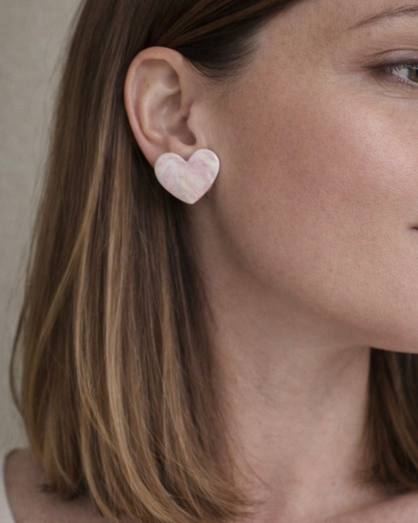 Orecchini a bottone a forma di cuore, dal delicato effetto marmorizzato rosa. Leggeri, romantici e perfetti per aggiungere un tocco dolce e raffinato a ogni look quotidiano.